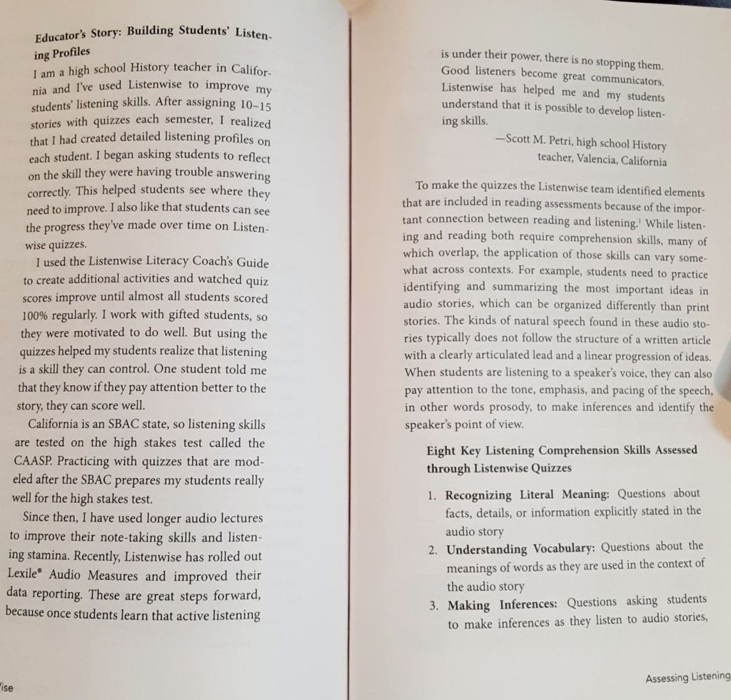 Monica Brady-Myerov has created a wonderful educational platform that teaches students to improve their listening using audio stories that cover content standards in Science, ELA, and Social Studies. She and her team have refined Listenwise over the years to precisely measure students and their progress at mastering eight key listening skills. With the recent inclusion of the Lexile Framework for Listening, I expect this area to increase in educational importance. California is one of 22 states that assess listening on their annual tests. Listening is especially important to English Learners who will make up one out of every four public school students by 2025. The combination of reading and listening builds their second language proficiency faster. Students gain confidence in their pronunciation when they hear the words spoken correctly.