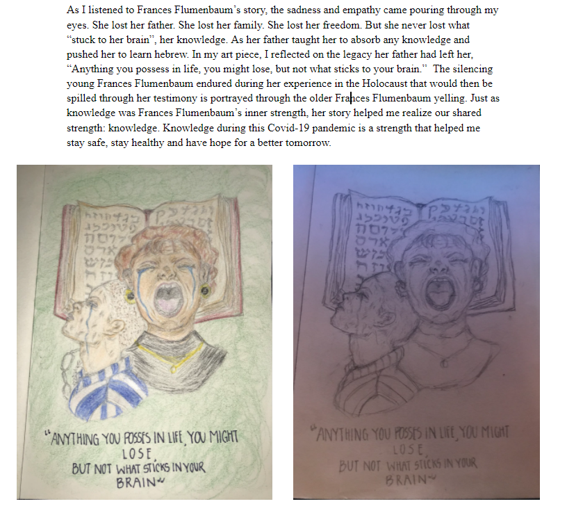 Chapman University had a wonderful prompt for their annual art and writing contest this year. “As you listen to the survivor’s or rescuer’s testimony, and as you reflect on the stories they tell, write down a specific word, phrase, or sentence that speaks to the inner strength of this individual and the role of connectedness in sustaining strength. As the person now entrusted with this individual’s memory, through your creativity in art, poetry, or prose, explore this word, phrase, or sentence as central to the survivor’s or rescuer’s story, your understanding of the Holocaust, and your own search for inner and shared strength during the Covid-19 pandemic.”