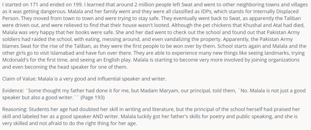 My students have been practicing their reasoning skills with CER. Every day at the end of their independent reading, they record their page numbers, summarize what they have learned, and identify one claim of fact, policy, or value. A student sample is pictured below.