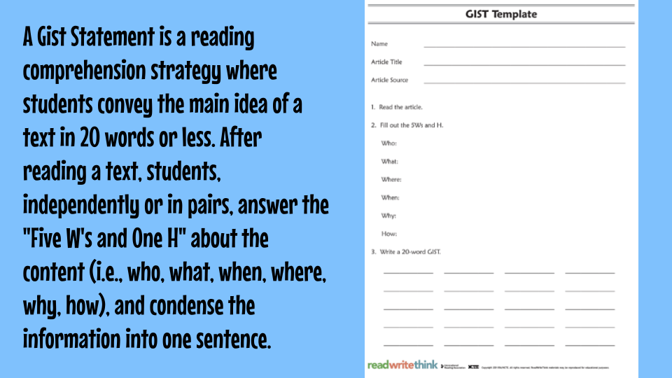 If your students are tired of debriefing and reflecting, then I suggest you teach them the GIST strategy. Simply ask them to select the five most important facts from their Number Mania and write one sentence for each fact. If the resulting paragraph tells the reader the five Ws and one H (who, what, when, where, why & how) — then they have created an infographic that captured the main idea of the reading. A more advanced synthesis task is pictured below.