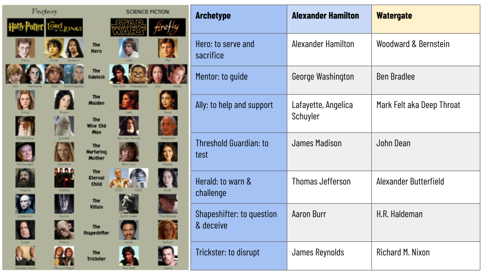 History is full of archetypal characters and situations. Almost every revolution and presidential scandal contain what Carl Jung, the founder of analytic psychology called archetypes or commonly repeating personality types that help simplify human behavior patterns. With practice, you can teach your students to recognize these story-telling techniques to make meaningful connections when studying complex phenomena. George Washington gave advice to Alexander Hamilton in a mentor role similar to how Ben Bradlee, the editor of the Washington Post, encouraged his reporters Bob Woodward & Carl Bernstein to keep digging deeper into the Watergate scandal.