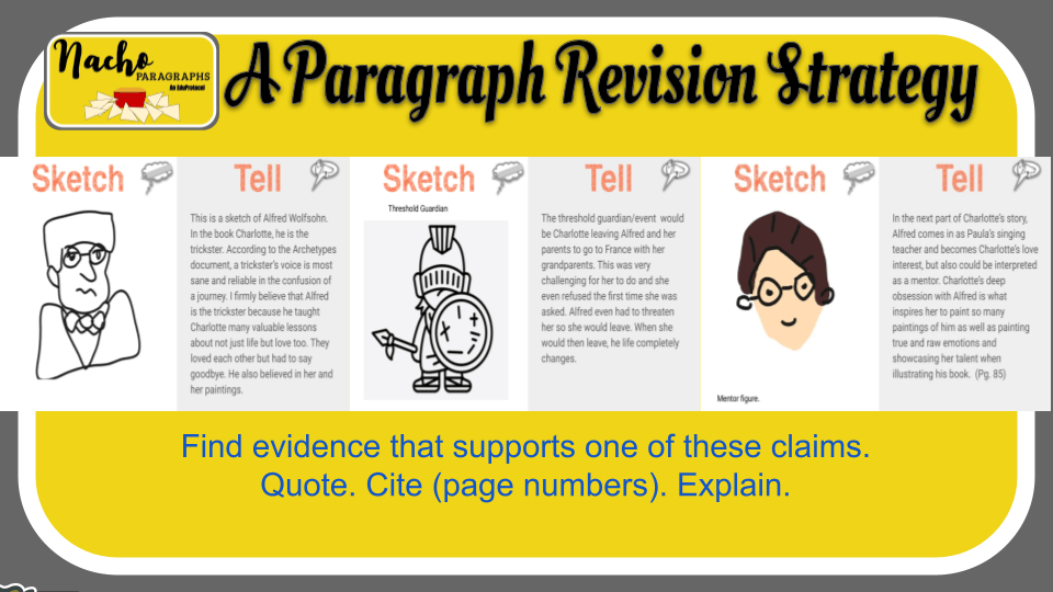 I have found the Nacho Paragraph EduProtocol well-tuned for helping students elaborate or clarify their rationale. This example shows how three students labeled the same character with different archetypes. To go deeper, I asked them to select one and elaborate with additional evidence. They were only given ten minutes to complete this task.
