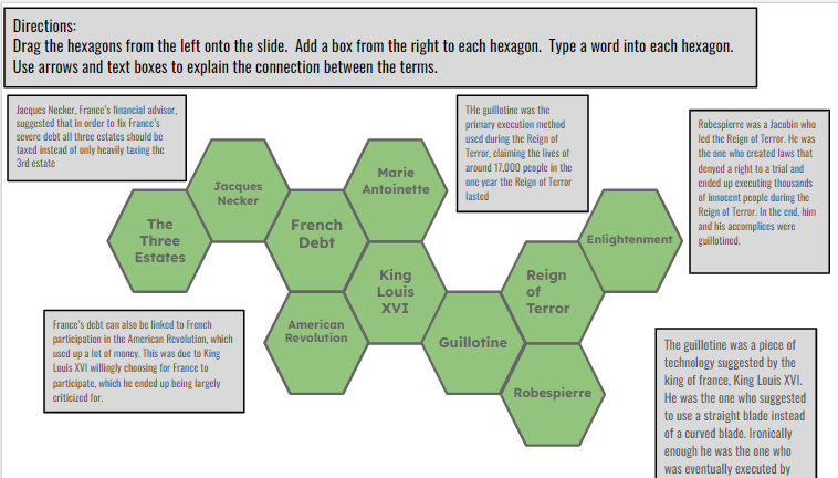 The Hexagonal Thinking strategy was developed by Betsy Potash and featured on the Cult of Pedagogy blog where there are templates for both paper and digital versions. Here is the three-minute explainer video that I didn’t have time to show. This is another low-stakes activity that will guide your students in discussing academic content. I would recommend trying it with 6-12 terms and names students should know. Give them a short amount of time, maybe five minutes, and see how many hexagons they can connect and explain. To increase rigor you can add more terms and time. I have asked my students to record two-minute Flip videos of these conversations to give them practice explaining their reasoning.